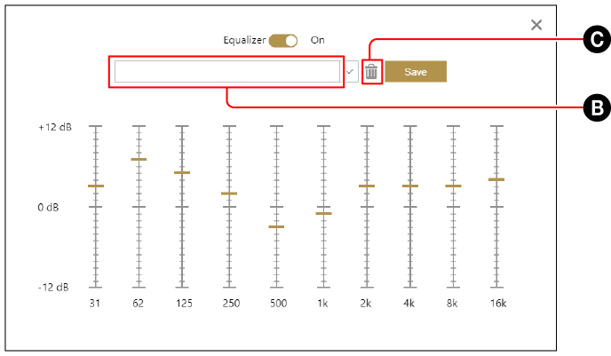 - Pour supprimer un réglage d’égaliseur programmé sauvegardé, cliquez sur l’icône de corbeille