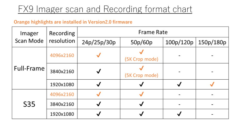 La version 2.0 du firmware de la FX9 prend en charge l'enregistrement 4K 60p/50p via le suréchantillonnage d'un capteur plein format 6K à partir d'une zone recadrée 5K. La version 2.0 permet également la sortie de signal RAW 4K 16 bits vers un enregistreur externe grâce à l'accessoire XDCA-FX9 en option. Cette profondeur de bits supplémentaire qui s'ajoute à la capacité d'enregistrement interne 10 bits de la caméra est idéale pour les projets nécessitant une post-production intensive.