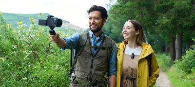Image montrant un couple filmant à l'aide d'un appareil photo équipé d'un microphone.